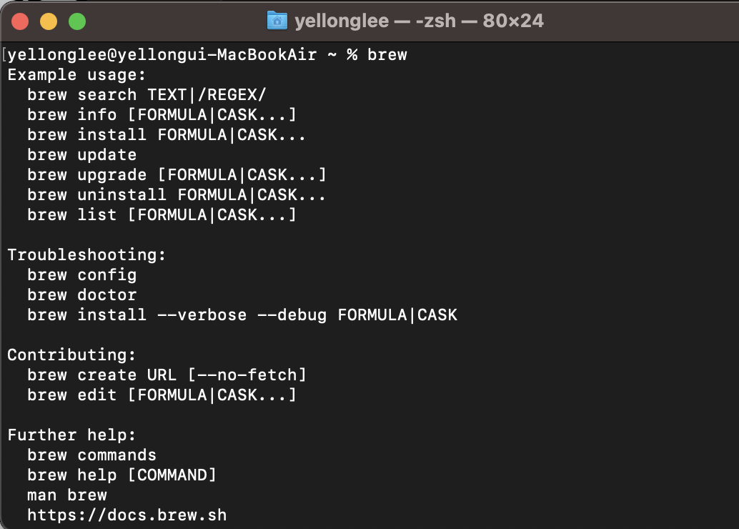 이후 brew 라고 타이핑을 하고 엔터키를 누르면 아래와 같이 나온다.
