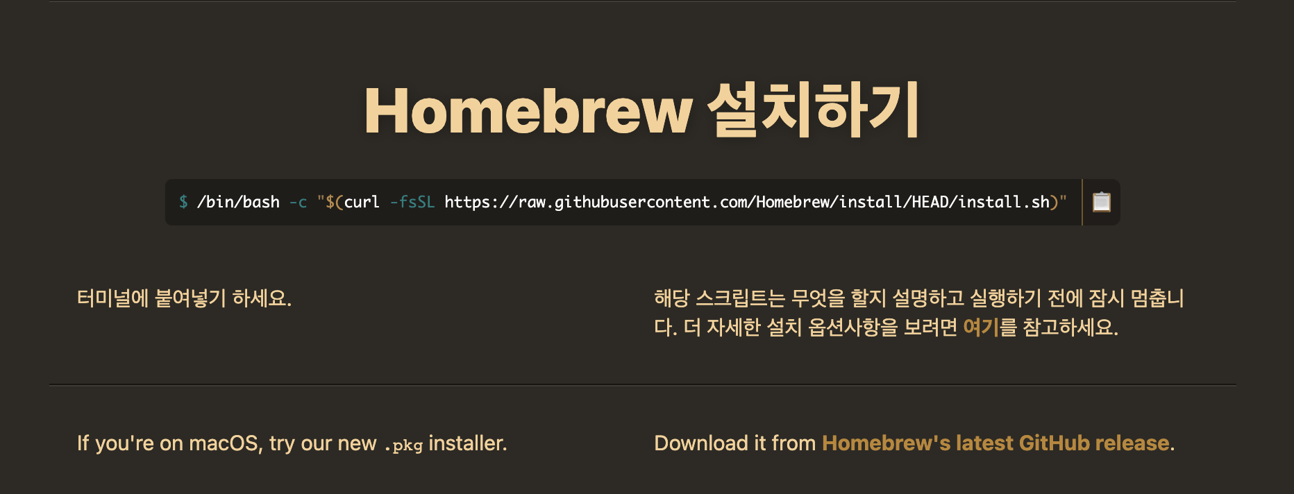 아래와 같이 터미널에 붙여넣기 하는 방식이 있긴 하지만, 환경변수 설정등 여러 문제가 있으므로 손쉬운 패키지형태의 다운로드 파일을 받아보도록 하자. Download it from Homebrew's latest Github release. 를 클릭하여 들어간다