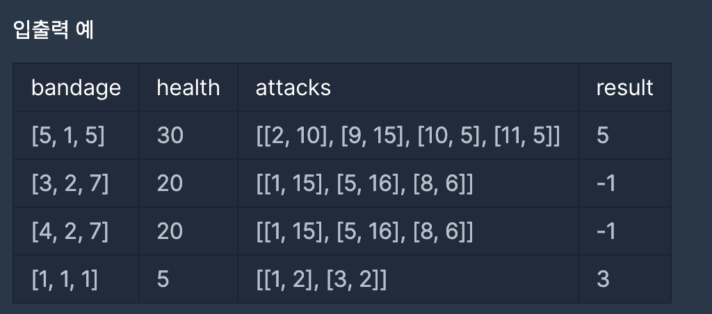 붕대 감기 기술의 시전 시간, 1초당 회복량, 추가 회복량을 담은 1차원 정수 배열 bandage와 최대 체력을 의미하는 정수 health, 몬스터의 공격 시간과 피해량을 담은 2차원 정수 배열 attacks가 매개변수로 주어집니다. 모든 공격이 끝난 직후 남은 체력을 return 하도록 solution 함수를 완성해 주세요. 만약 몬스터의 공격을 받고 캐릭터의 체력이 0 이하가 되어 죽는다면 -1을 return 해주세요.